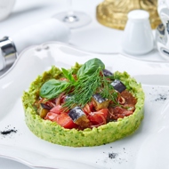 Make a puree from the avocado flesh using a fork and place it on a plate using a ring mold.