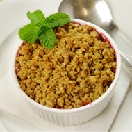 Place the fruit mixture into four individual baking dishes, sprinkle the pistachio mixture on top, and bake in an oven preheated to 347°F for about 30 minutes. (To speed up the process, you can cover the dishes with foil.)