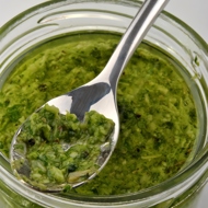 In a blender, combine the asparagus, spinach leaves, minced garlic, pistachios, Parmesan, olive oil, and a little lemon juice, season with salt, and blend until smooth.