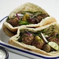 The perfect Mediterranean fast food that fits seamlessly into American culinary culture. The meatballs (again enhanced with cinnamon) pair wonderfully with onions, tomatoes, and olives. The pita will turn out juicy, but if you want a sauce, Greek tzatziki or Italian pesto are the best choices.