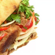 Wrap two pitas in foil and warm them slightly in the oven. Cut them in half and fill with salad and slices of meat.