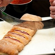 Dust the table with flour and roll out the dough into a rectangular shape. Lay the ham and pepperoni on the dough first, then add provolone and mozzarella (either in pieces or grated), leaving 3–4 cm at the edges.