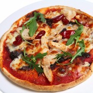 Top the dough with duck fillet, mushrooms, and onion, season with salt, layer the tomatoes on top, and sprinkle with grated cheese and herbs.