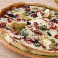 Bake for twenty minutes until golden brown. Cut the finished pizza into four pieces and serve hot or cold.