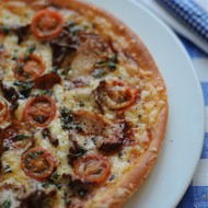 Prick the dough with a fork, spread tomato sauce on top, add the mushrooms, halved cherry tomatoes, sprinkle with cheese, and bake at 428°F for 15 minutes.