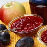 Wash the apples and plums. Cut the plums in half and remove the pits and stems. Remove the seeds from the apples and slice them.