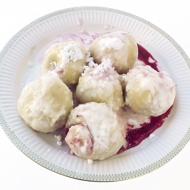 Form balls from the dough and fill each with pitted plums rolled in sugar.