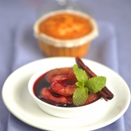 Cut the plums in half, remove the pits, and add them to the saucepan with the wine.