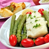Poached Cod with Asparagus and Wine-Lemon Sauce