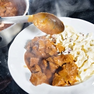 A Hungarian wedding dish made with veal or beef served with noodles.