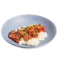 Poke can be served on a bed of cooked white rice or on its own.