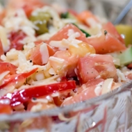Combine the vegetables and dress the salad with the sauce. To do this, whisk the vegetable oil with mustard, add salt, sugar, and chopped dill and cilantro.