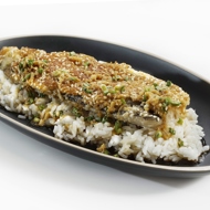 Pour the sesame seeds and breadcrumbs onto a flat plate and place the fish in it with the 'egg' side facing down. Transfer the fish to a larger plate with the breaded side facing up.
