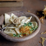 On a floured surface, roll out the dough into a thin sheet and cut out circles using a cookie cutter. Place a filling in the center of each circle, pinch the edges to seal, and shape them into dumplings. Boil the dumplings in lightly salted water for 7–9 minutes after they float to the surface, then remove with a slotted spoon, arrange on a plate, and serve.