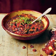 Serve, garnished with pomegranate seeds and thinly sliced mint.