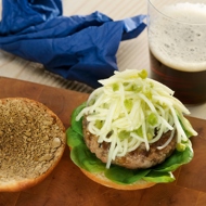 Slice the rolls in half. On the bottom halves, layer the spinach, then the patties, add the kohlrabi, and drizzle with the wasabi dressing — and top with the upper halves of the rolls.