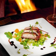 Sauté the vegetables in butter, and for the meat, prepare the sauce by reducing balsamic vinegar over low heat until thickened. Arrange the garnish on plates, add a few slices of roasted meat, and drizzle with the balsamic sauce — then serve immediately.