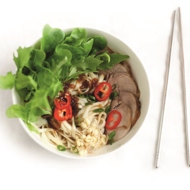 In a bowl, place the bean sprouts, then the noodles, arrange the meat and herbs around the edges. Drizzle with 2–3 tablespoons of warmed sauce, and sprinkle with shallots and chili pepper.