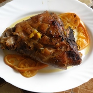 Before serving, place the pork knuckle on a platter along with the baked mandarins and herbs.