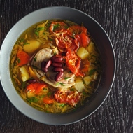 To serve the soup, pour it into a bowl, add pieces of pork knuckle, sun-dried tomatoes, and red beans. Sprinkle with chopped parsley.