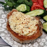 Arrange the sliced vegetables on a plate. Place the cooked pork loin on top.