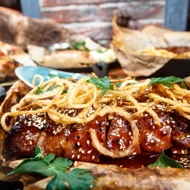 After 6 hours, remove the ribs, discard the onion, place the ribs in parchment after drizzling with barbecue sauce, and put them in the microwave for a few minutes. Remove the ribs, cut the parchment, and sprinkle with cilantro. Serve hot.
