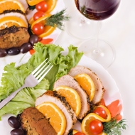 Slice the roasted meat and arrange it on a platter, layering it with pieces of orange.
