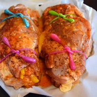 Slice the peeled peppers into strips about 1 cm thick, evenly distribute them on the two rolls. Cut the pork from the wide edge and open it like a book, place the same spices, strips of bell pepper, and slices of tomatoes inside, carefully holding the edges, roll it up, tucking in the narrow edge slightly to prevent the filling from spilling out. Then tie the roll with kitchen twine, silicone baking cords, or regular thick thread, or simply secure the edges with toothpicks, place it in a baking dish, topping it with a sprig of rosemary, or crumble it with your fingers, sprinkle the meat, and send it to the preheated oven for 40 minutes.