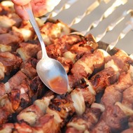 Preheat the grill or barbecue. Thread several pieces of meat onto skewers.