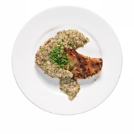 Add 2 tablespoons of whole grain mustard to the onions and garlic, pour in white wine and broth. When the volume reduces by half, add cream and continue to simmer.