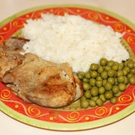 The simplest and quickest way to prepare meat is by making steaks. They are usually made from beef, but I had a little over half a kilo of pork tenderloin in the fridge, so I decided to make steaks from it. Pork steaks can be served with simple sides; in my case, it's rice and canned green peas.