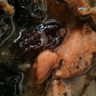 Simmer on low heat for about forty minutes, until the pork absorbs the flavor of the prunes and the liquid turns a brown color.