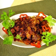 Heat half of the remaining oil in a pan over medium heat. Add half of the meat and fry until golden brown. Transfer to a plate. Repeat the same with the remaining oil and meat. Return the meat to the pan and pour in the sauce. Bring to a boil and serve.