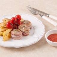 Slice the pork tenderloin into 6 equal medallions across the grain, wrap each in bacon, secure with a wooden skewer, and fry in the olive oil from the cherry tomatoes for 1.5 minutes on each side, seasoning with salt and pepper.