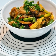 Peel the asparagus. Cut the asparagus and young corn into small pieces. Slice the garlic, ginger, and chili pepper.