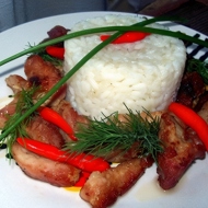 Sauté the pork in oil, add the chili pepper, onion, season with salt, and cook everything together until done.