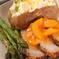 Add the peach pieces, wine, lime juice, and zest, cover with a lid, and simmer for 5-8 minutes. Sprinkle with spices and serve with vegetables.