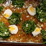 Top the casserole with the eggs and the peas with spinach, and sprinkle with feta cheese.
