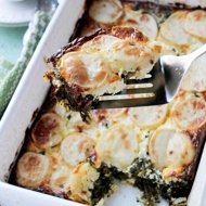Layer the spinach on top, sprinkle with feta cheese, and add another layer of potatoes on top.