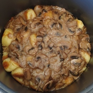 Cut the mushrooms into small pieces, add them to the onion, and continue frying. Add a pinch of flour, salt, pepper, and cream, and simmer for a bit.