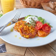 Arrange the finished potato pancakes on a plate, add a poached egg, halved tomatoes, and garnish with fresh herbs.
