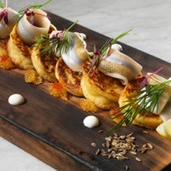 Potato pancakes with pickled smelt