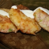Grate the potatoes, cheese, and ham. Add the eggs, green onions, season with pepper, and salt if needed.