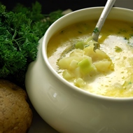 Peel and wash the potatoes, cut them into cubes, pour in a small amount of milk mixed with 1.5 l of water, and cook until soft. Mash the potatoes and pour in the broth.