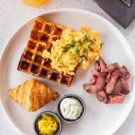 Place the scrambled eggs on the potato waffle and add your preferred toppings – the chef recommends slices of lightly salted salmon or roast beef, as well as avocado slices.