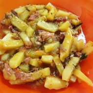 Drain the water from the potatoes and transfer them to the pan with the canned meat. Simmer for 5–10 minutes with the lid on. Add salt/pepper to taste.