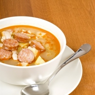 Pour in 1.5 liters of water, add the onion, bay leaf, black pepper, and chorizo, and bring to a boil. Reduce the heat, cover, and simmer for 1 hour.