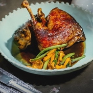 A local version of the famous French dish coq au vin, or rooster in wine. With local accents, such as adding chanterelles and other regional mushrooms to the pot. Recipe from a popular American bistro.
