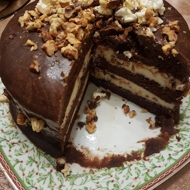 Remove the cakes and cut each one into 2 parts. Spread cream on each layer except for the top one, and sprinkle walnuts on the cream. Cover the top layer with glaze. To make the glaze, melt 100 grams of butter in a saucepan, add 8 tablespoons of sugar, 2 tablespoons of milk, and 2 tablespoons of cocoa powder. Stir for about 5 minutes. Pour over the cake and spread immediately, as it sets quickly!