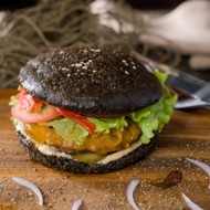 Layer with onion rings (10 g), the patty, caramelized onion, cheddar cheese, tomatoes, lettuce leaf, and ginger.